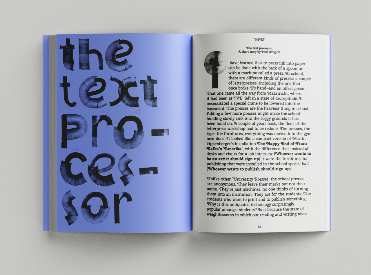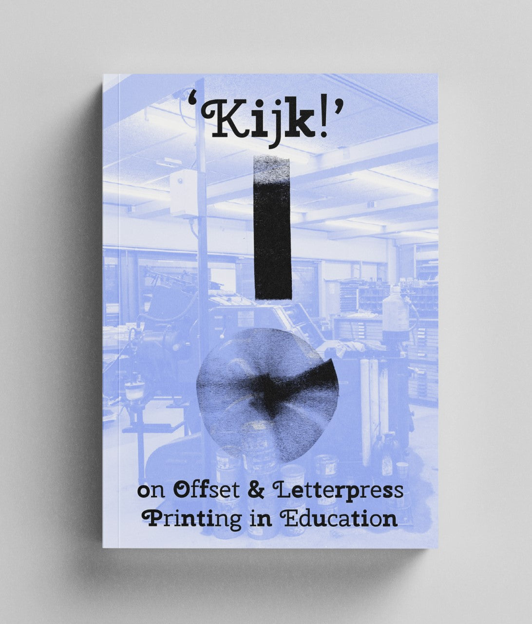 Kijk! is a celebration of printing culture at the Gerrit Rietveld Academie, made to mark the retirement of Joos Wiersinga, who has been manager of the Letterpress & Offset workshop for twelve years. Letterpress and offset are old printing techniques, but more than ever relevant inside the walls of an art school today. Analog printing work allows one to experiment with the physicality of paper, ink, pressure, typographies, and water. It also builds a deep understanding and care in communication through collective and critical experiences. Next to that, letterpress and offset techniques offer an overview of the entire printing process, from concept to production, and how these are inevitably intertwined.